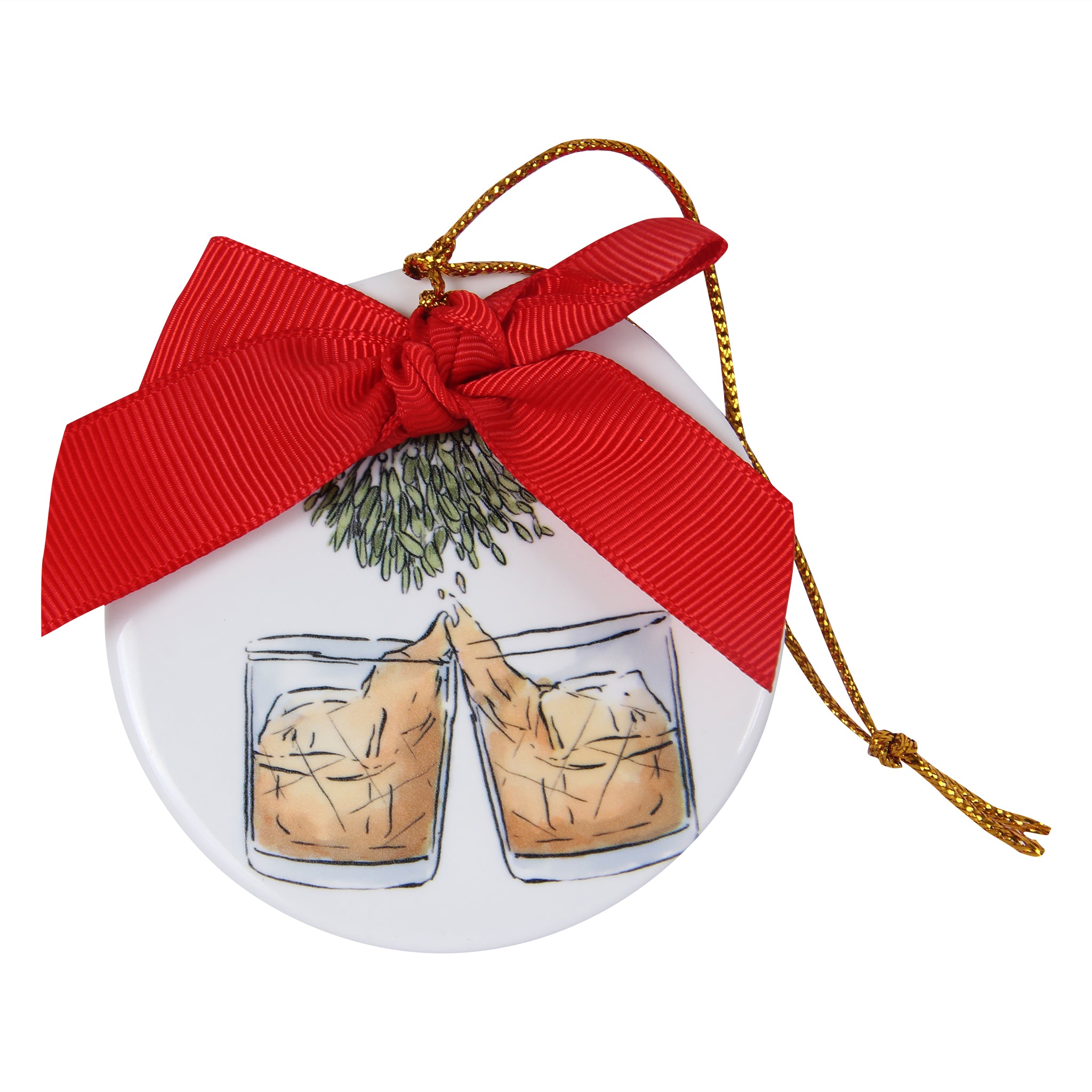 Add a festive touch with this Cheers Under The Mistletoe Ceramic Ornament, featuring two bourbon glasses clinking “cheers” under the mistletoe. Finished with a bright red bow, it’s the perfect way to toast the season and spread holiday cheer wherever it hangs.