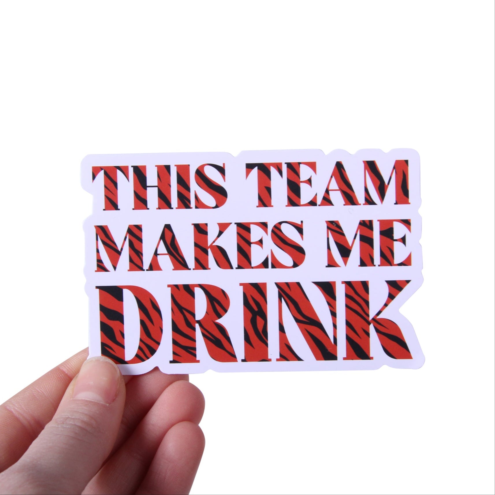Add a playful touch to your fan gear with the This Team Makes Me Drink Sticker, featuring bold tiger-striped letters and a cheeky phrase perfect for expressing those intense game day feelings. Ideal for laptops, water bottles, or notebooks, this sticker brings Ohio spirit and a fun sense of humor wherever you stick it.