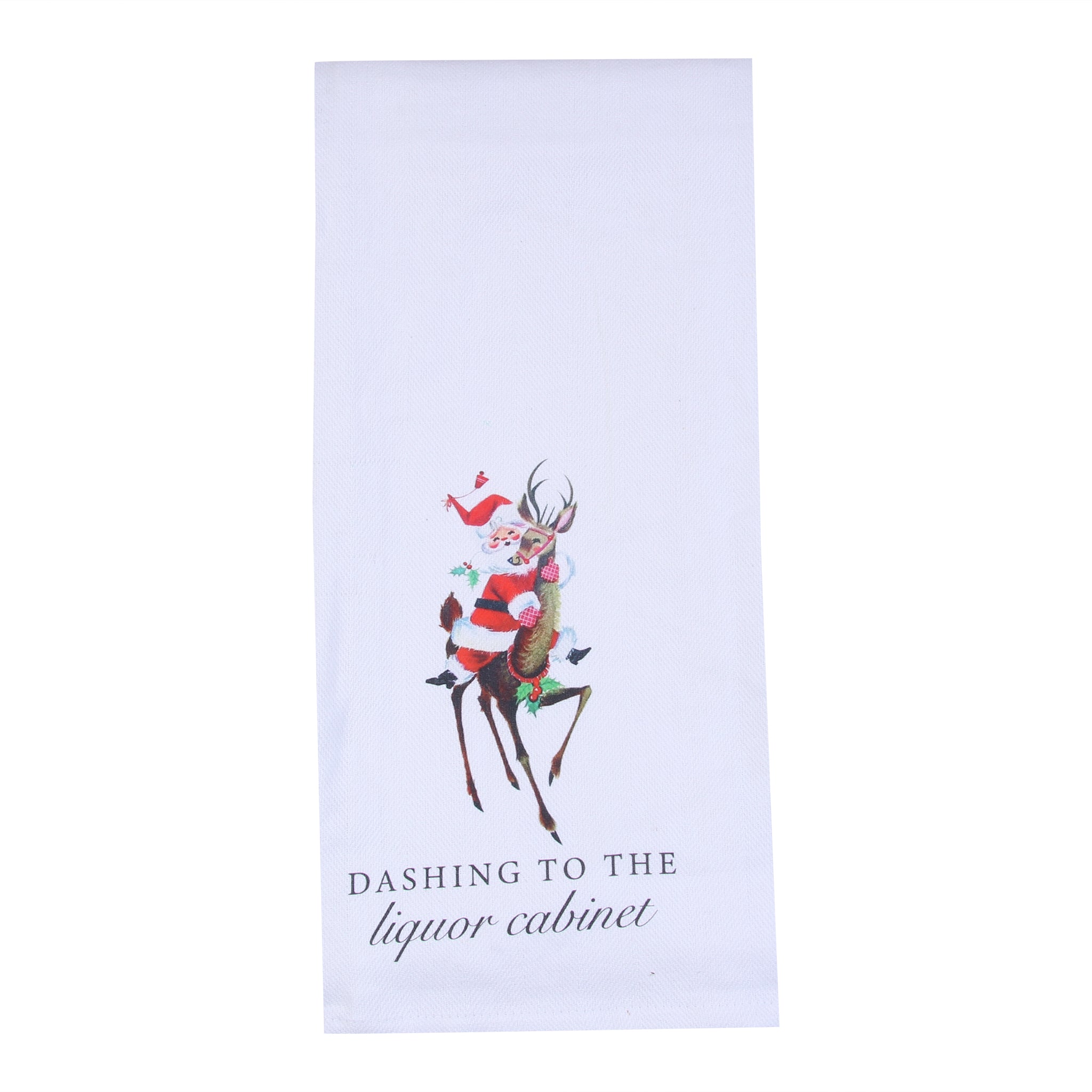 Add some festive fun to your kitchen with the Dashing to the Liquor Cabinet Tea Towel. Featuring a playful illustration of a reindeer paired with witty holiday text, this tea towel brings humor and holiday cheer to your cooking and entertaining space.