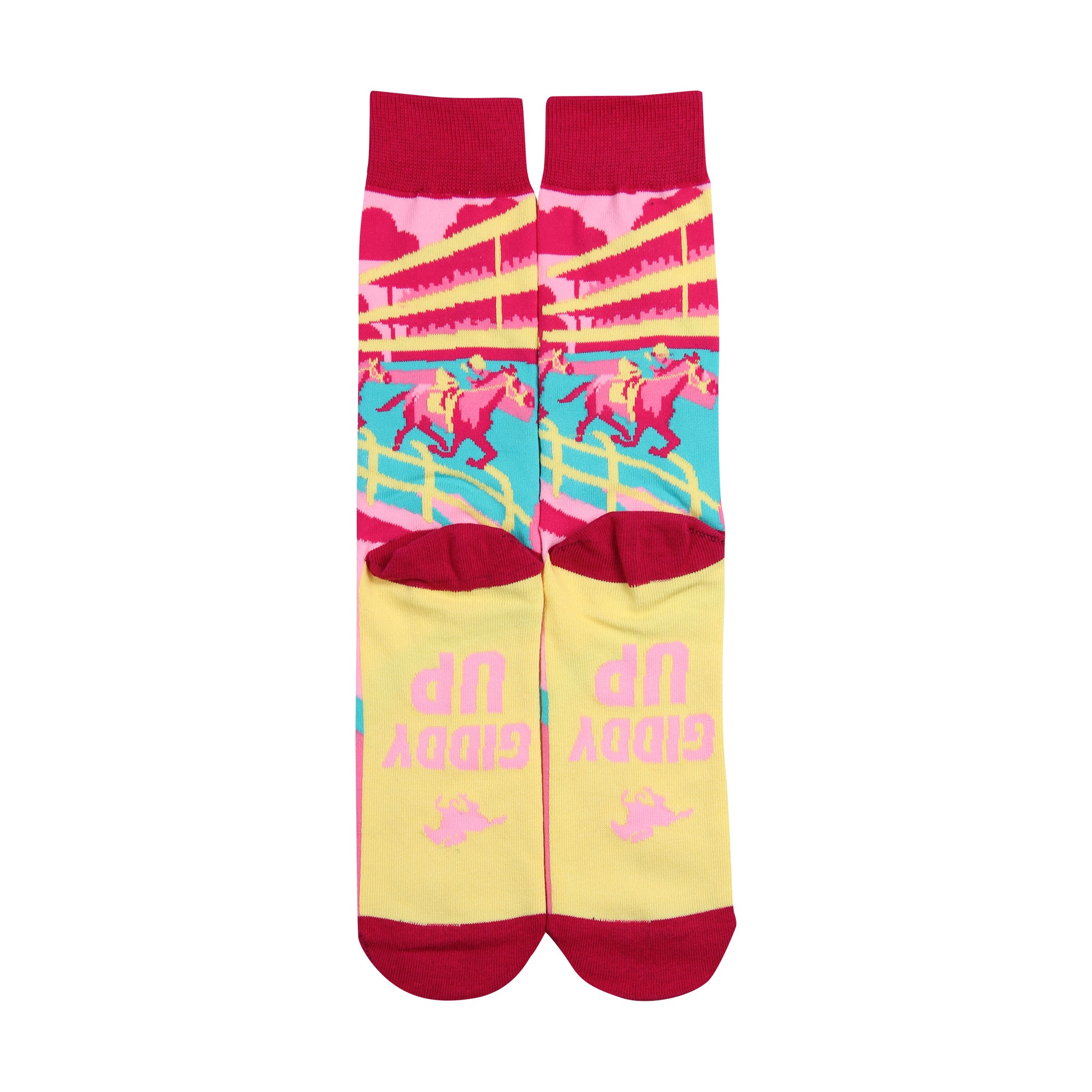 Get ready to saddle up your sock drawer with these fun Giddy Up Derby Socks! Featuring a vibrant illustrated scene of a jockey cheering on the action at the horse race, complete with "Giddy Up" text, these socks bring a playful spirit to your everyday style. Perfect for horse racing enthusiasts, western lovers, or anyone who appreciates a good laugh, they're the ideal conversation starter for your feet. Slip them on and let your personality shine through!