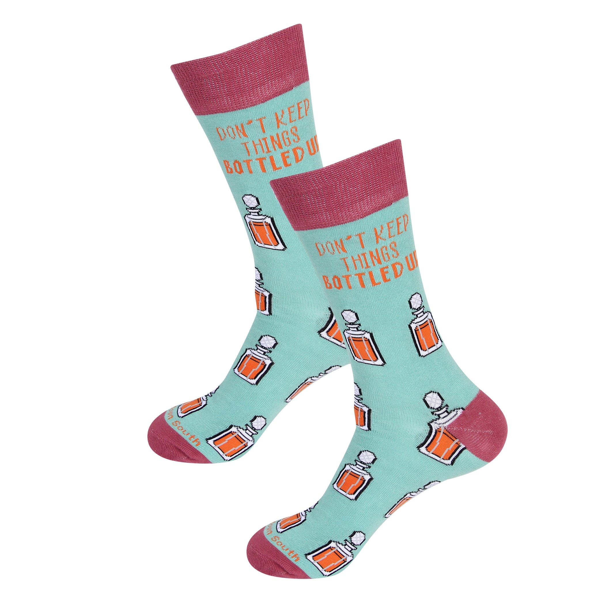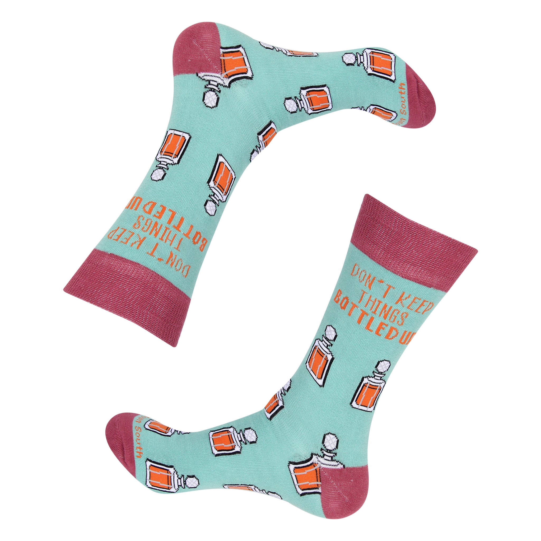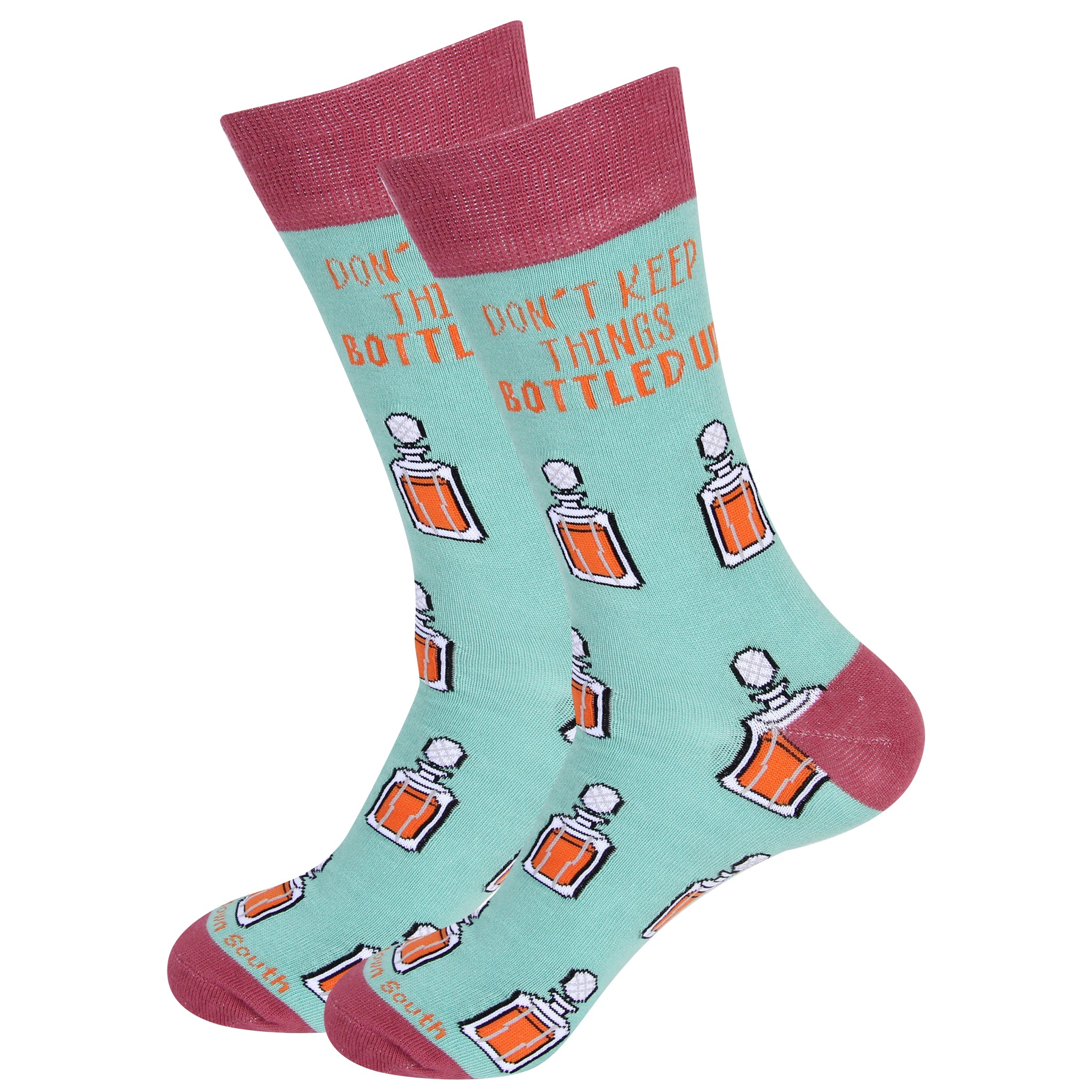 Pour a little personality into your step with the Don’t Keep Things Bottled Up Decanter Socks, featuring clever text and a stylish repeating pattern of whiskey decanters set against a rich teal background. These socks are the perfect blend of humor, charm, and whiskey-lover pride—designed for those who know how to unwind in style.