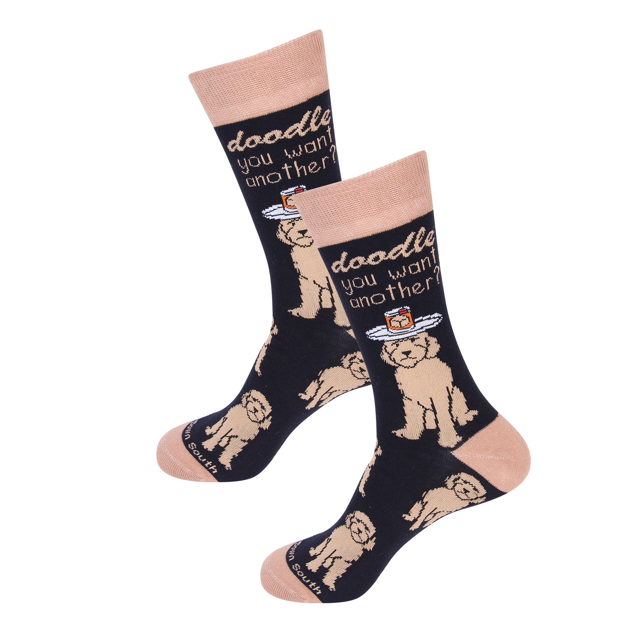 Serve up style and smiles with our Doodle You Want Another Golden Doodle Socks, the perfect blend of comfort, humor, and puppy-powered charm. Featuring an adorable golden doodle dog playfully presenting a drink, alongside the cheeky phrase “Doodle You Want Another?”, these novelty socks are the ultimate treat for dog lovers and cocktail enthusiasts alike.