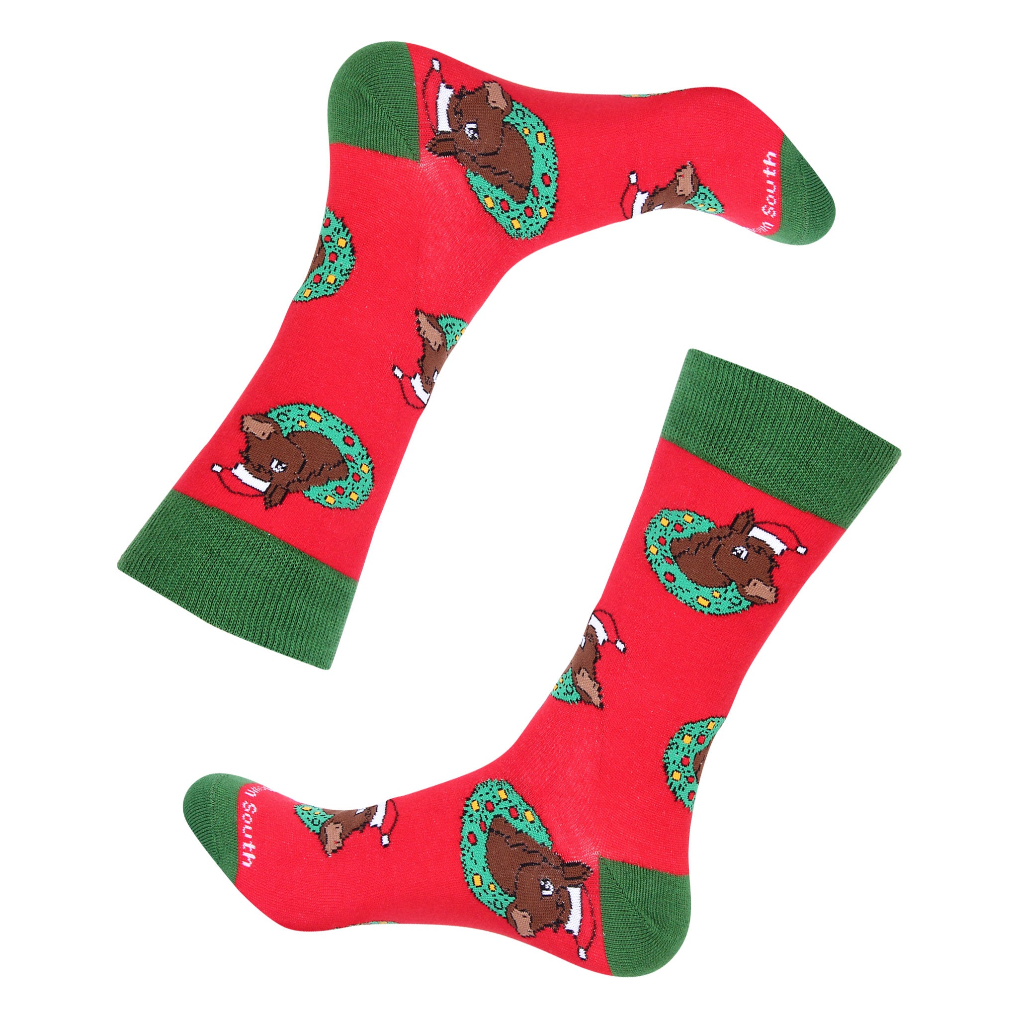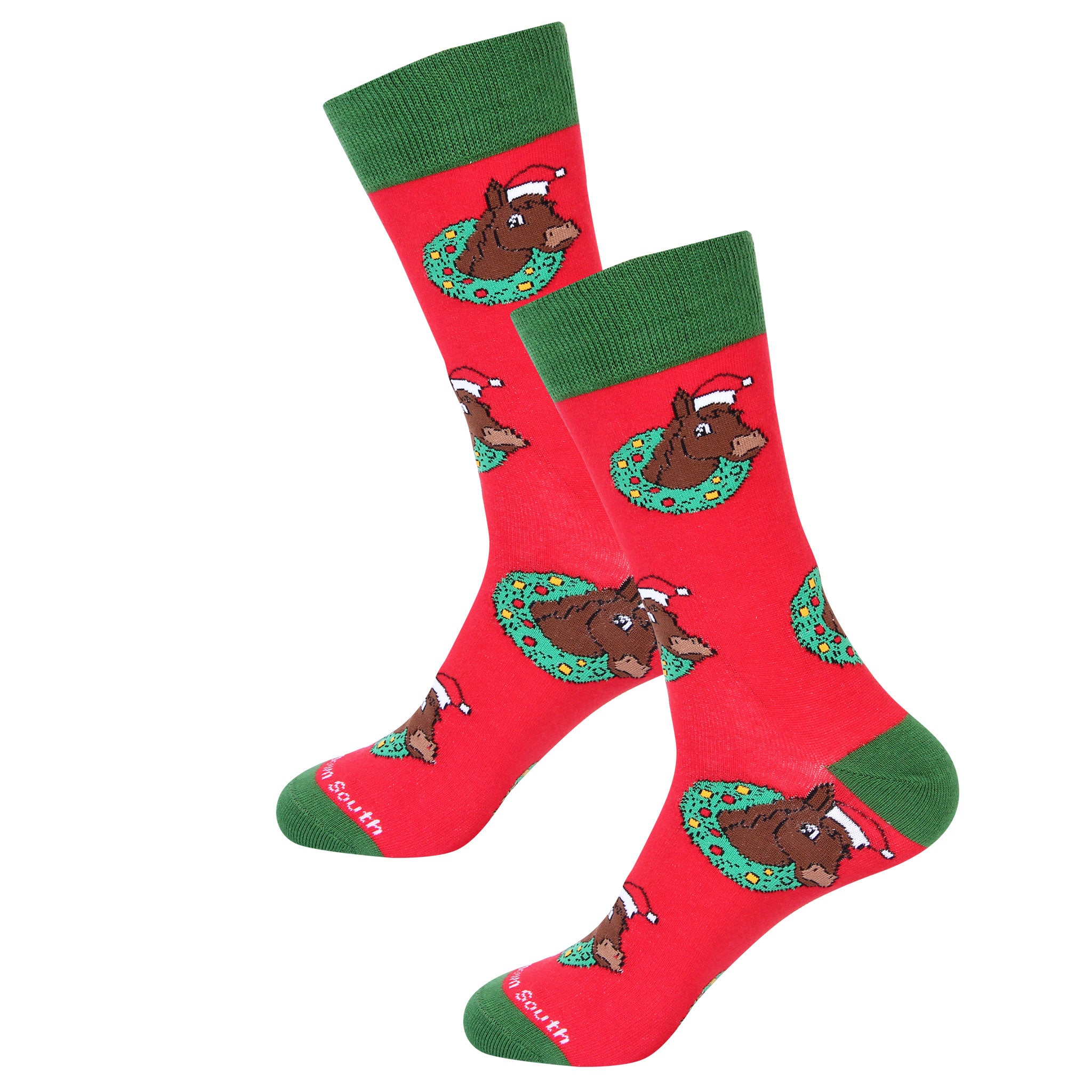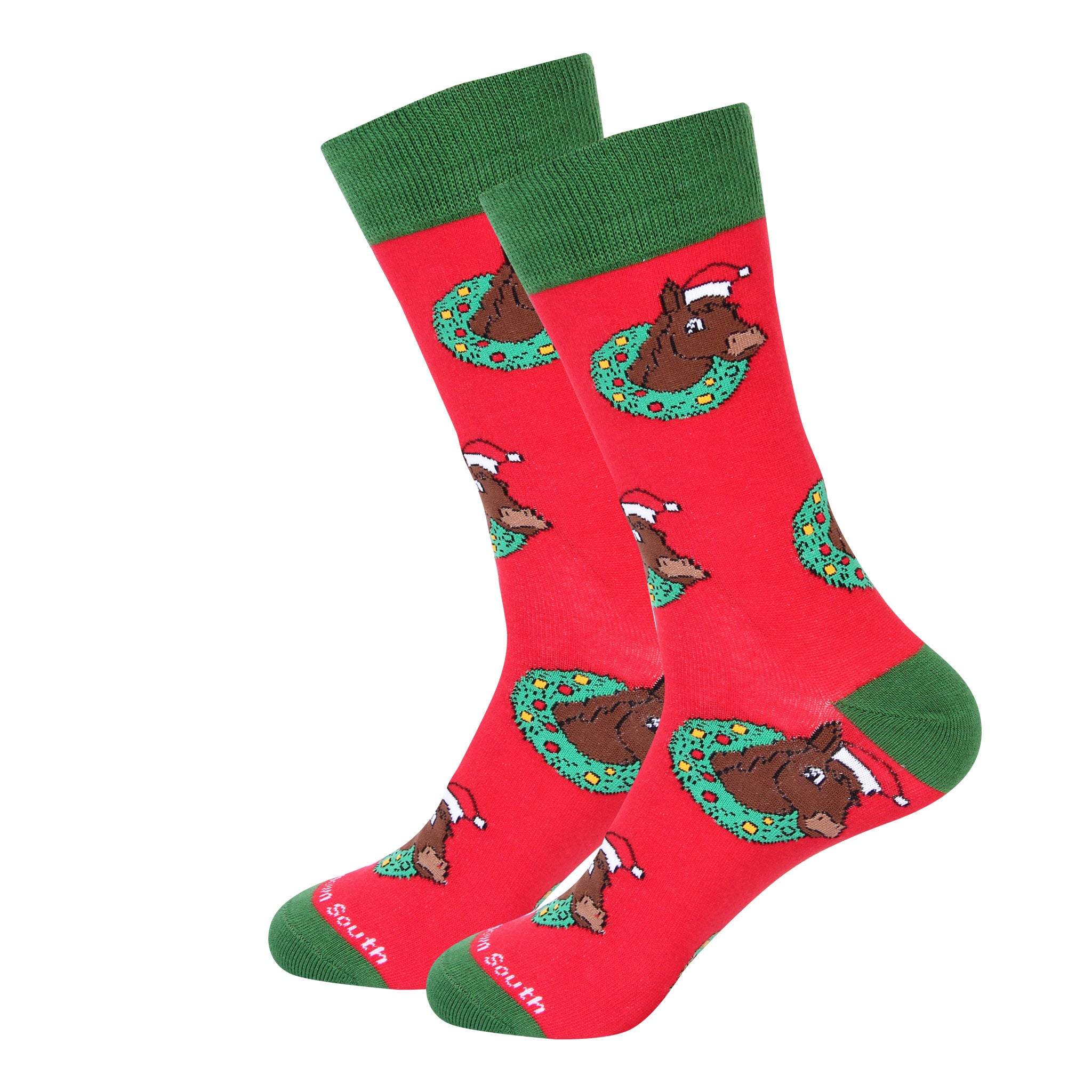 Step into fun with these Horse Head and Wreath Socks! Featuring a charming horse head surrounded by a festive wreath, they add a playful touch to any outfit. Perfect for horse lovers or anyone who enjoys a quirky, spirited style. Comfortable and eye-catching, these socks bring a bit of whimsy to your day.