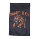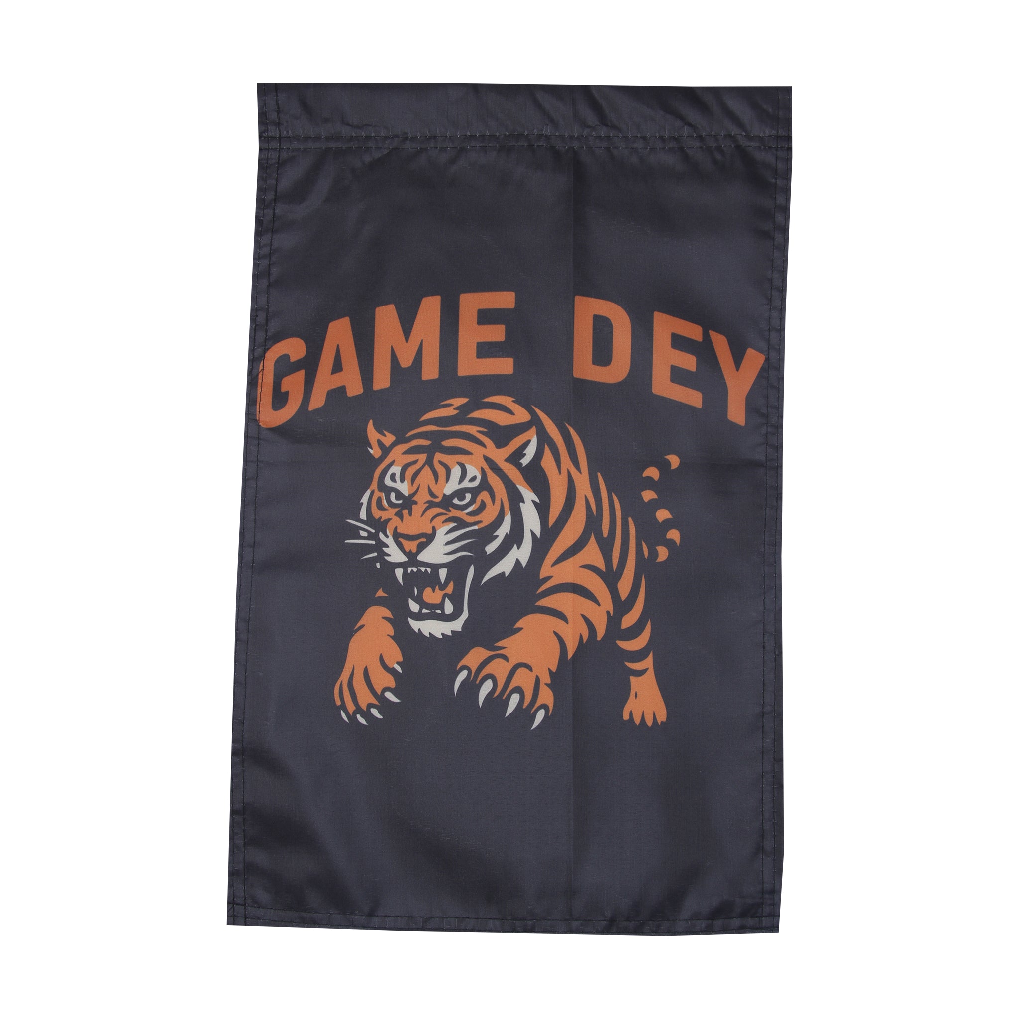 Make a bold statement with this fierce garden flag, perfect for showing off your game day spirit. Featuring a striking orange tiger mid-roar against a sleek black backdrop with the phrase “Game Day” in bold lettering, this design is both powerful and eye-catching.