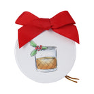 Celebrate the holidays with this playful ceramic ornament showcasing a bourbon glass adorned with festive holly. Tied with a bright red bow, it’s the perfect charming addition to your seasonal decor.