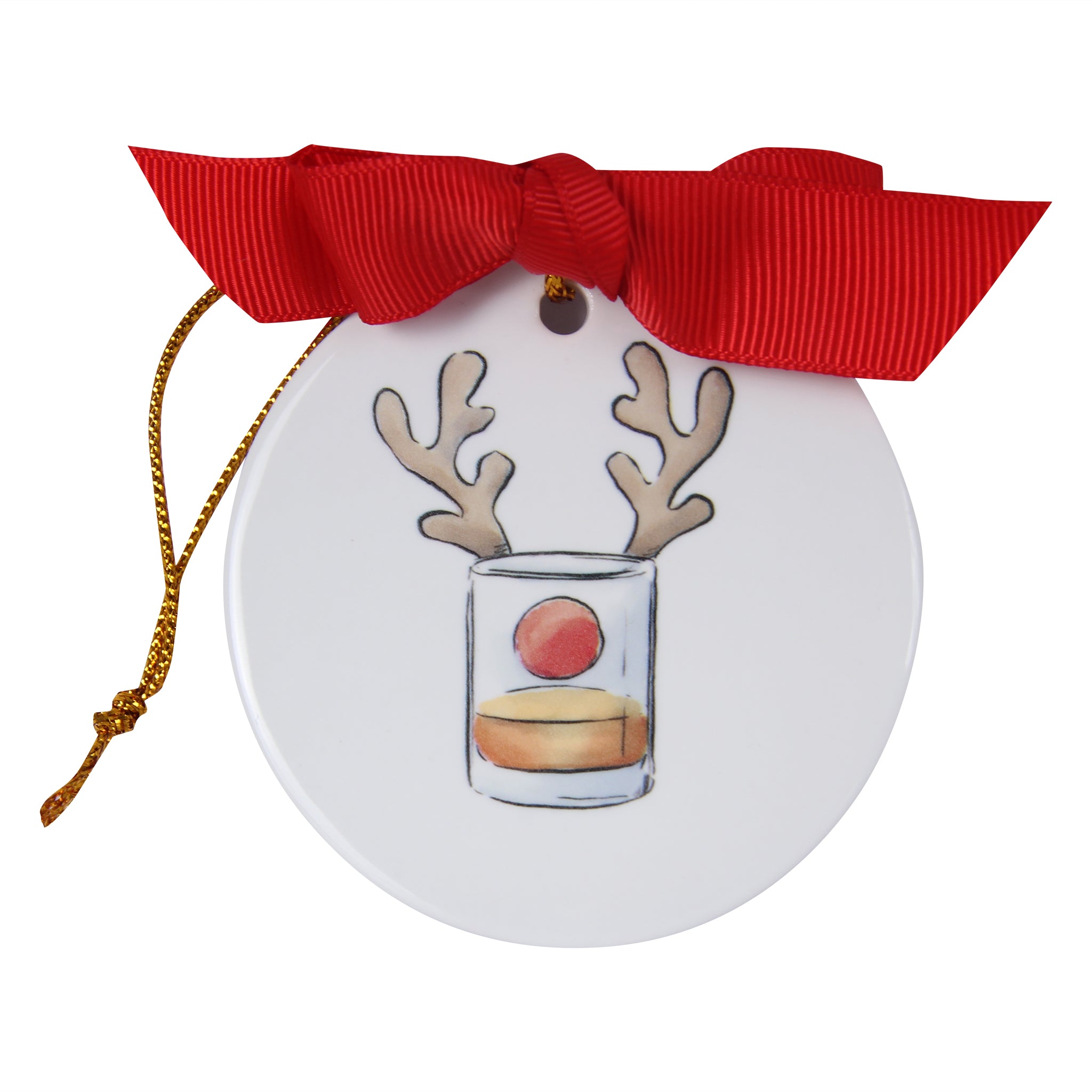 Add a festive twist with this playful ceramic ornament featuring a bourbon glass sporting a red nose and reindeer antlers. Tied with a bright red bow, it’s the perfect cheerful accent for your holiday decor.