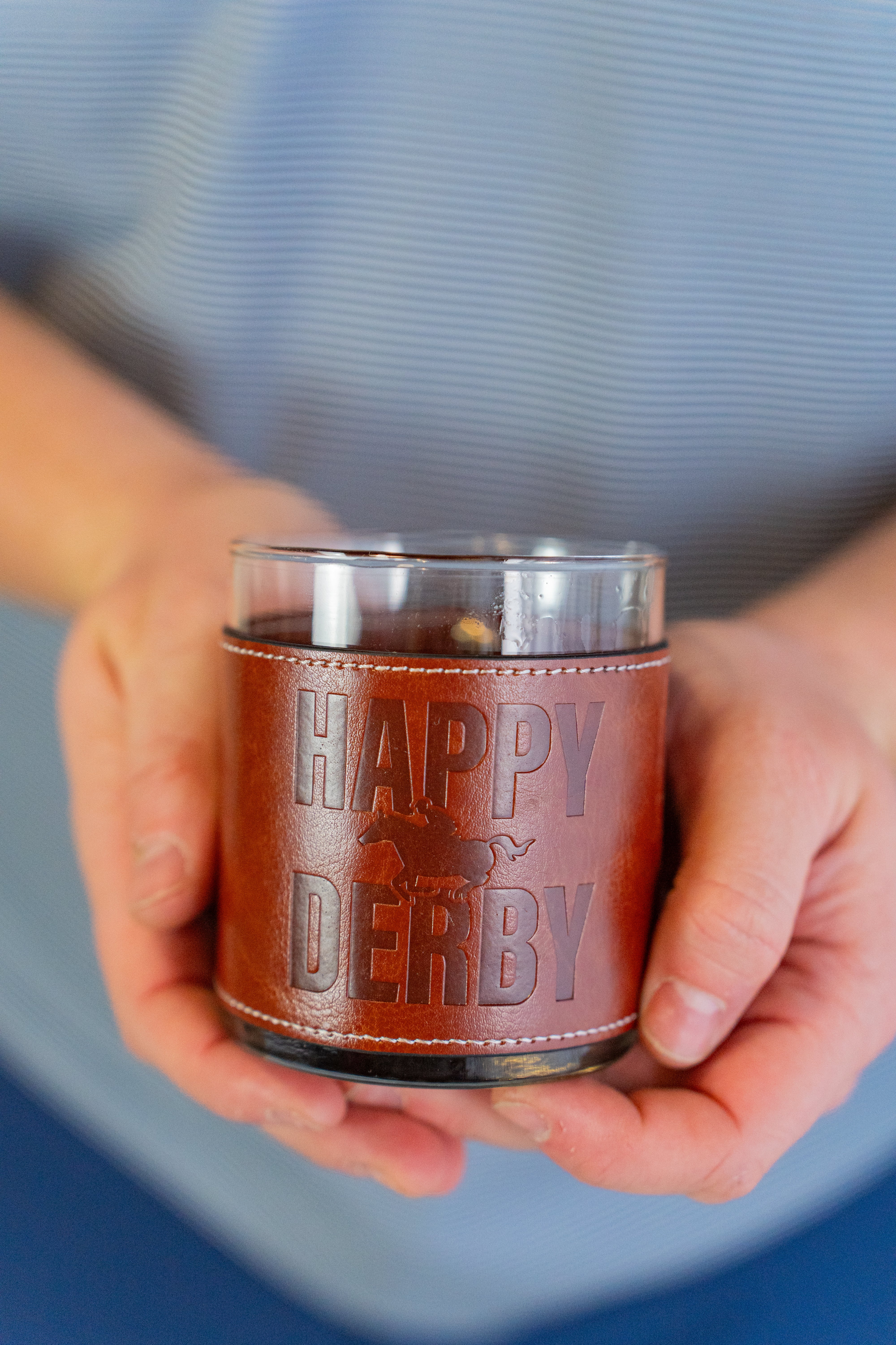Elevate your cocktail experience with our Happy Derby Faux Leather Rocks Glass. Made with faux leather, this double old fashioned bourbon whiskey glass is perfect for sipping on your favorite spirit. Enhance your drinking experience with a touch of luxury. Cheers!
