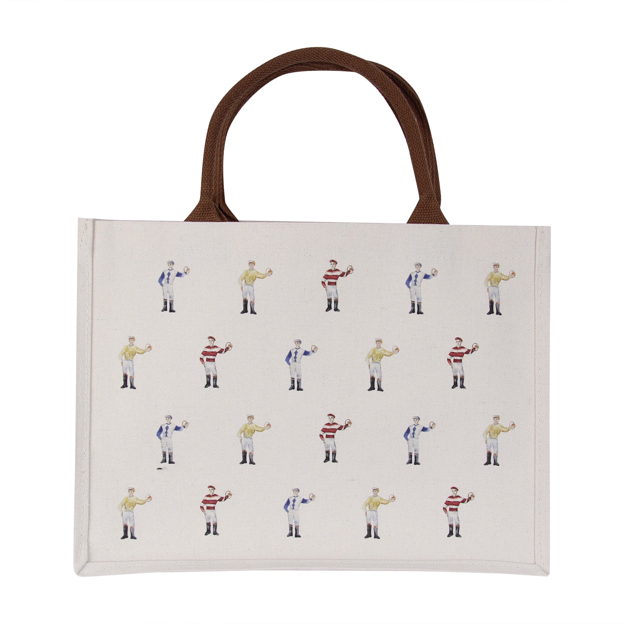 Saddle up your style with this spirited Standing Jockey Tote Bag showcasing a parade of colorful derby jockeys in their finest racing silks. Perfect for the horse racing enthusiast or anyone who loves a splash of equestrian charm, this playful carryall brings Kentucky Derby energy to your everyday adventures. The vibrant, repeating jockey pattern makes a bold statement whether you're heading to the track, the market, or just around town. Durable and roomy, it's the ideal companion for toting your essentials with a whole lot of personality.