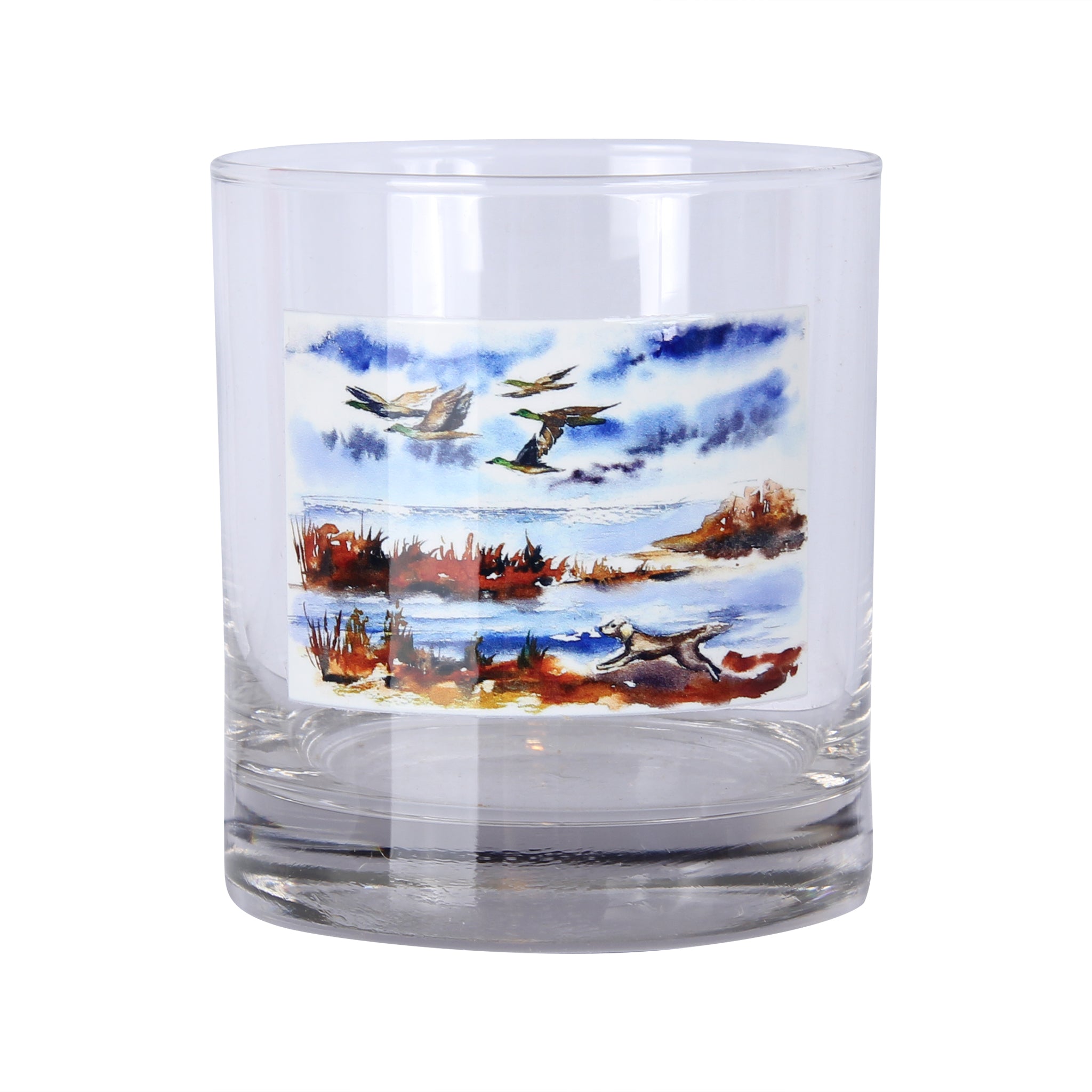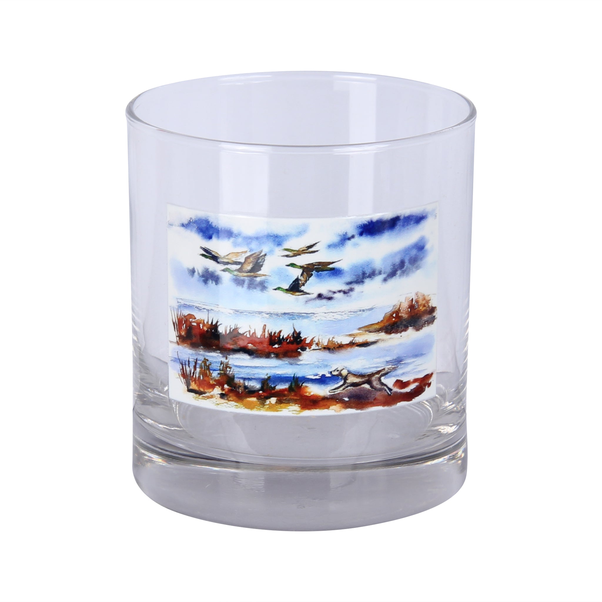 Raise a glass to man's best friend with this charming Hunting Dog Rocks Glass showcasing a spirited hunting dog in hot pursuit of birds across a scenic landscape. Perfect for whiskey, bourbon, or your favorite spirit, this playful design captures the thrill of the hunt with a touch of Southern charm. A delightful addition to any collection, whether you're a hunting enthusiast or simply appreciate quirky barware that brings a smile to your face.