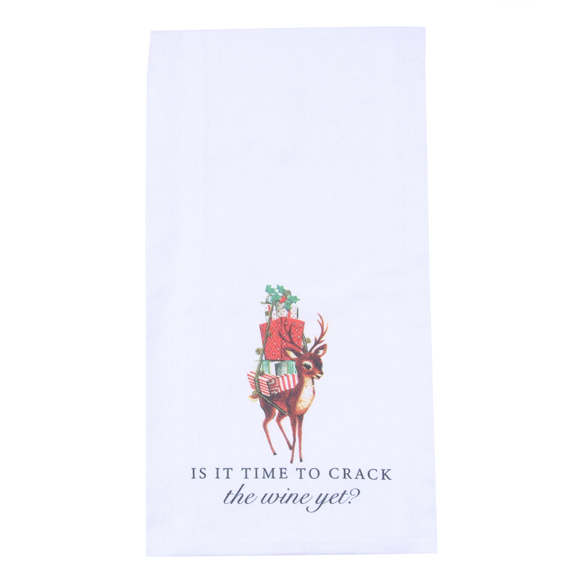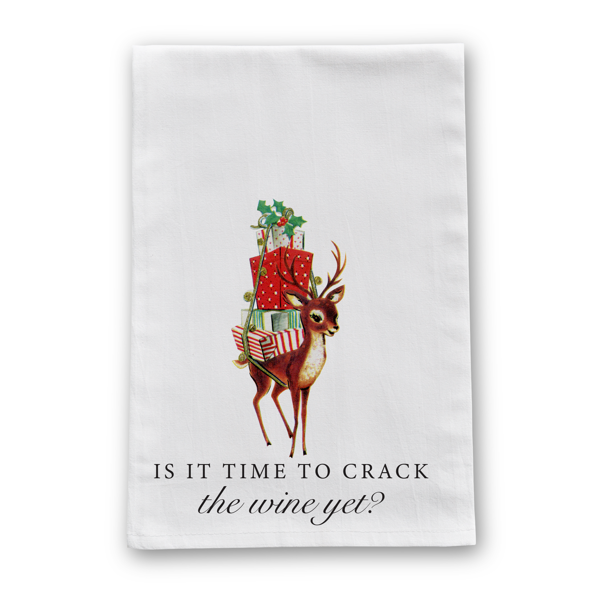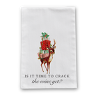 Bring holiday cheer and a touch of humor to your kitchen with the Is It Time to Crack the Wine Tea Towel. Showcasing a charming reindeer carrying gifts alongside playful text, this festive tea towel is perfect for wine lovers and holiday enthusiasts alike.