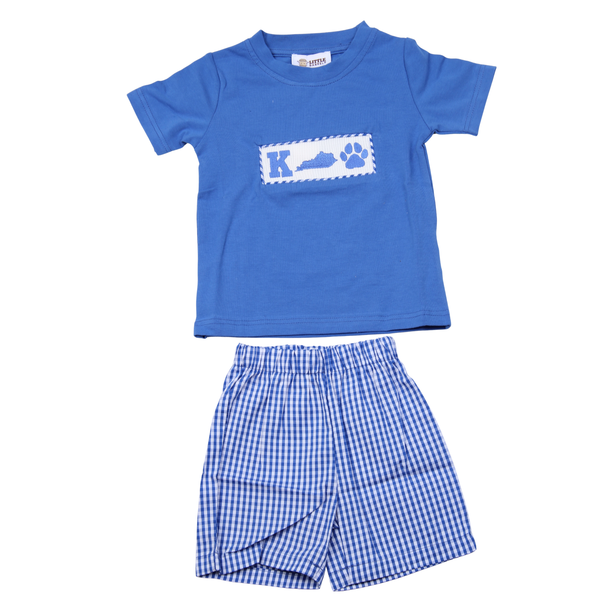 Let your little one show their Kentucky pride with this adorable Kentucky Shape Paw Print Boys 2PC Set! Featuring classic blue and white gingham shorts paired with a coordinating blue shirt decorated with charming Kentucky-themed icons, this outfit captures Southern spirit with a playful twist. Perfect for game days, family gatherings, or everyday wear, it's a fun way to celebrate the Bluegrass State. Comfortable and stylish, this set keeps kids looking sharp while staying true to their roots.