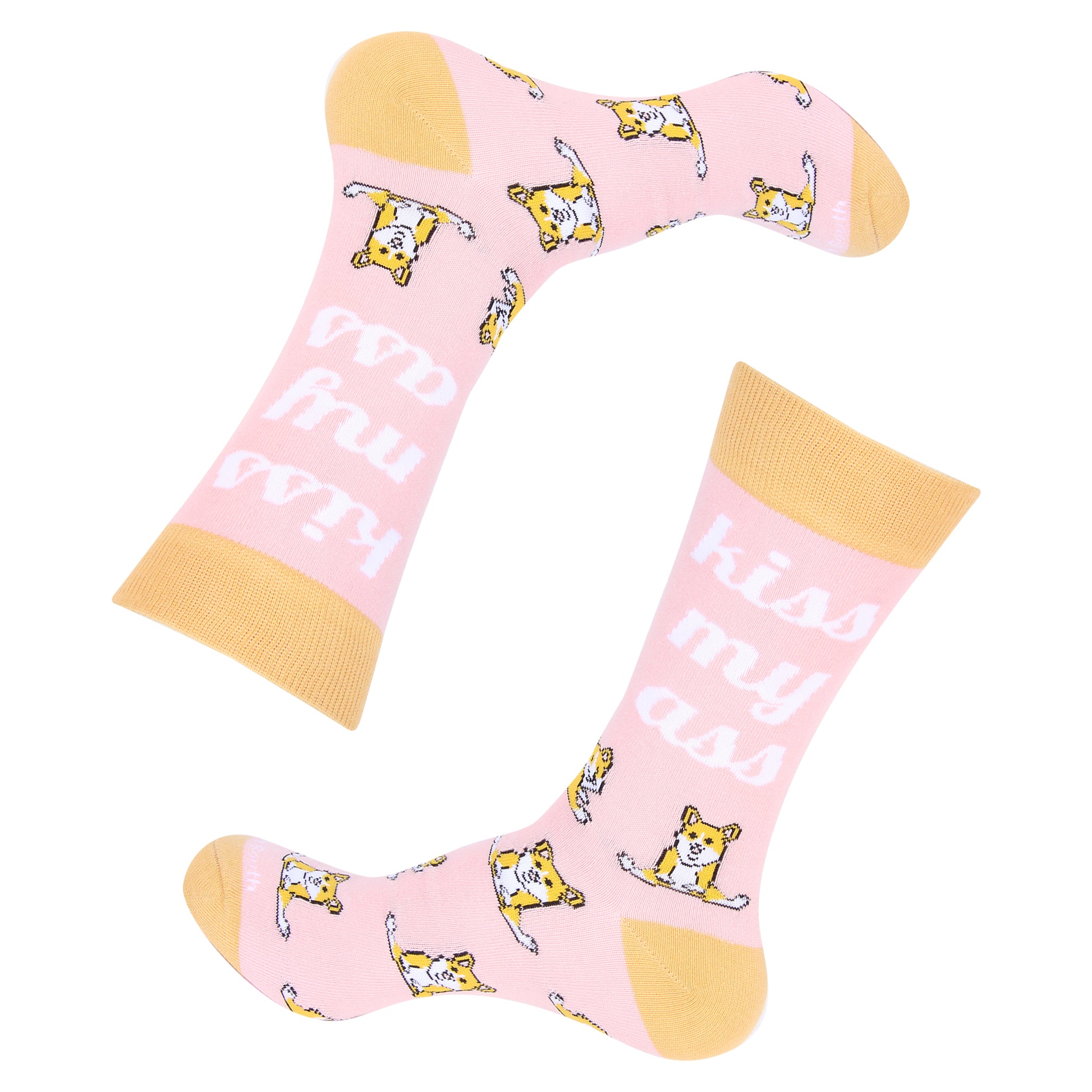 Step up your sock game with these fun and sassy Kiss My Ass Corgi Socks, featuring a repeating pattern of lovable corgis on a vibrant pink background, paired with a cheeky message that’s equal parts humor and personality. Perfect for corgi fans, dog lovers, or anyone who appreciates a bold, playful twist on classic fun socks.