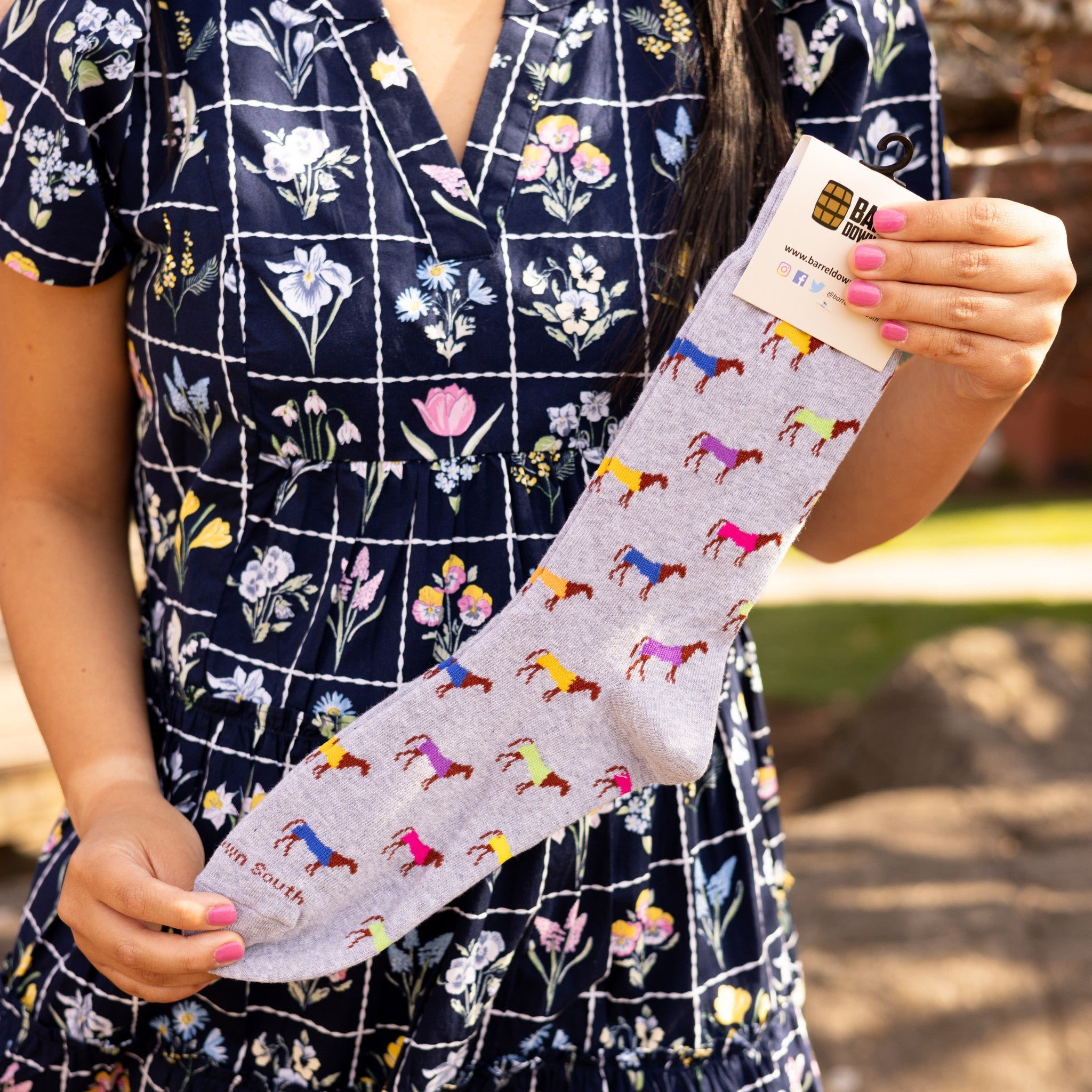 Celebrate the beauty and spirit of the equestrian world with our Multi Color Horse Socks. Featuring a lively repeating design of horses in bold, vibrant colors against a sleek grey background, these socks are a stylish nod to horse lovers, derby fans, and anyone who appreciates standout accessories with a touch of wild charm.