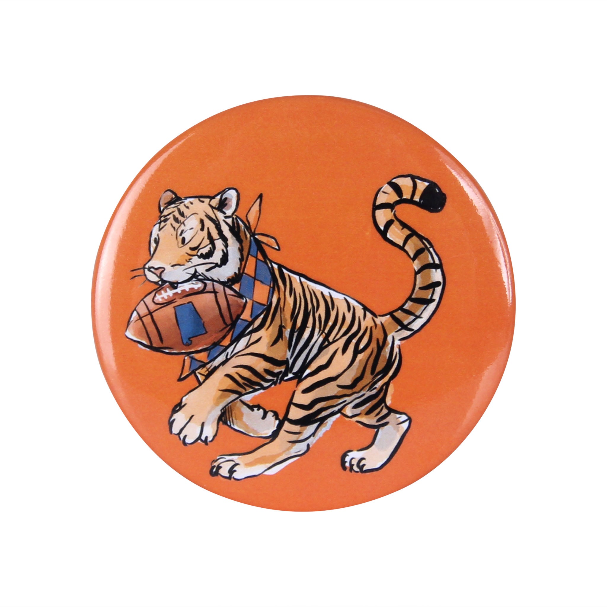 Show your team spirit with this playful Orange Tiger Button Pin, perfect for football tailgates. Its vibrant orange and tiger design adds a fun, bold touch to your game day outfit, making you stand out in the crowd while cheering on your favorite team.