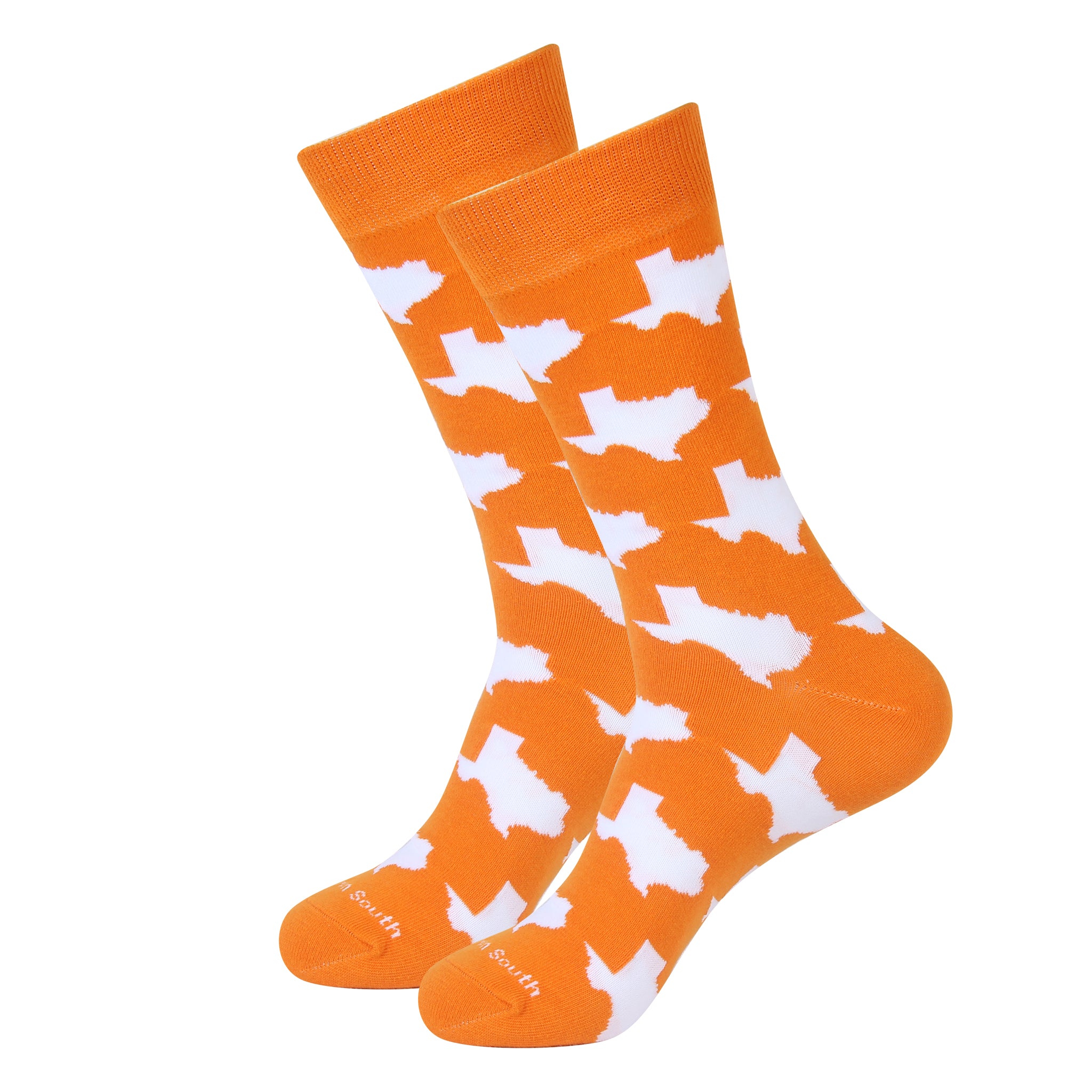 Show off your Texas roots in style with these eye-catching Orange/White Texas Shape Socks, featuring a crisp white repeating pattern of the Lone Star State set against a brilliant orange background. Whether you're born-and-raised Texan, a proud transplant, or just love all things Texas, these socks are a bold tribute to Southern spirit and state pride.