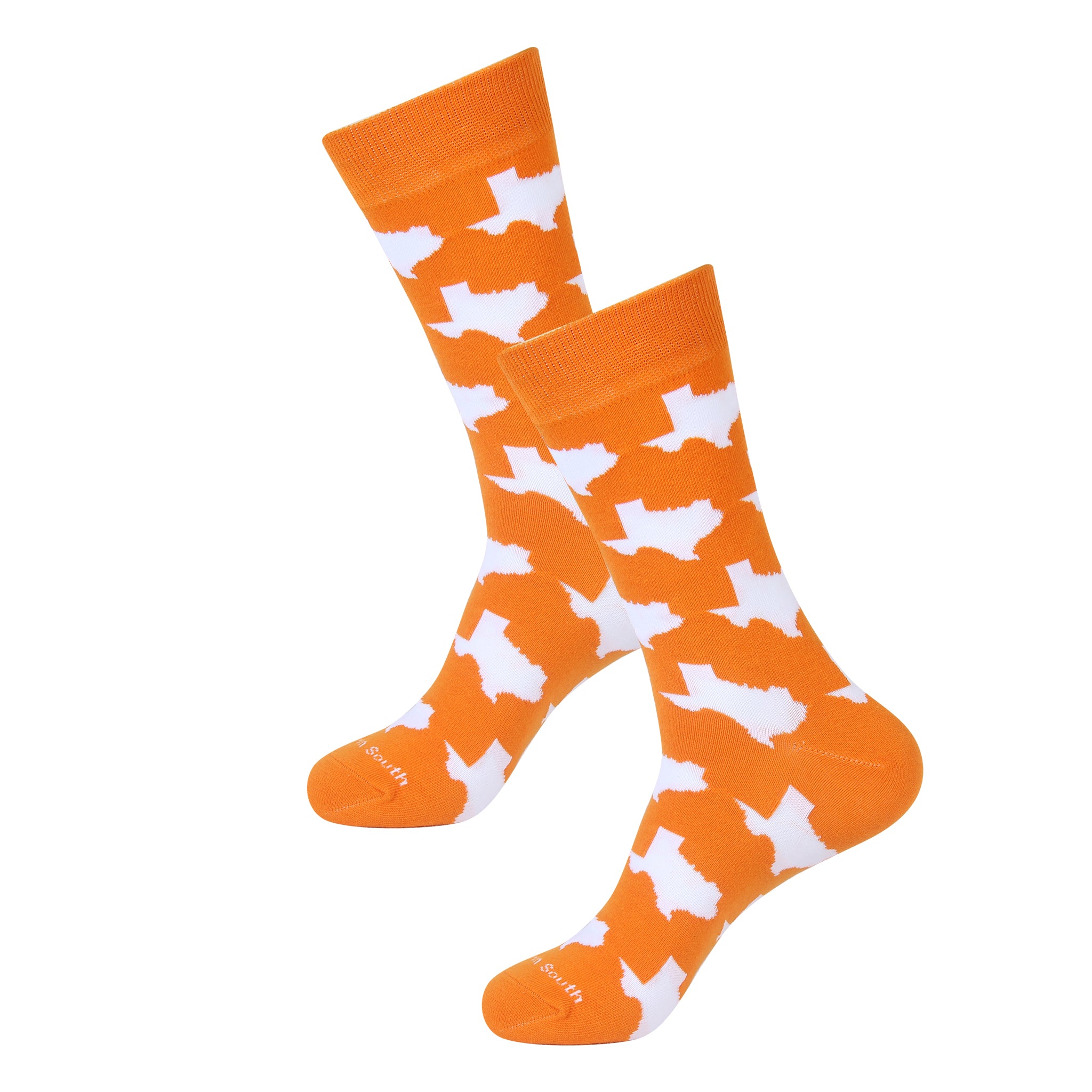 Designed for those who walk tall and think big, these socks are a perfect blend of personality and pride. The vibrant orange base makes the clean white state silhouettes pop, creating a unique look that pairs well with everything from casual boots to dress shoes.