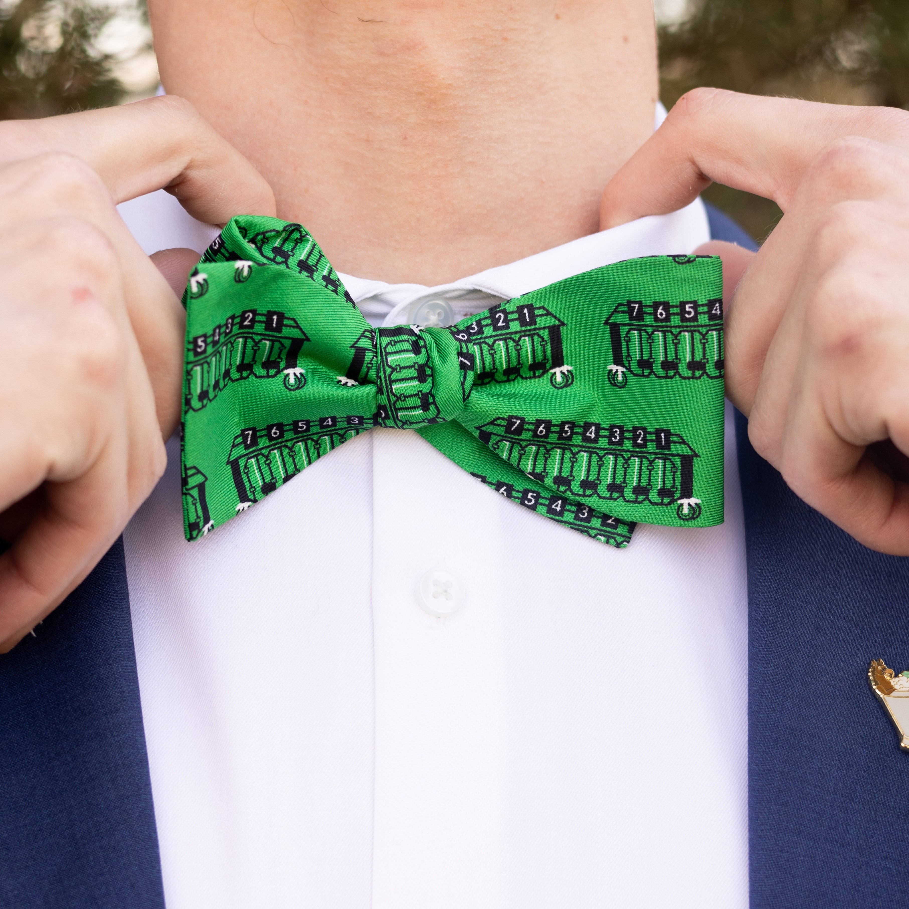 Show off your love for horse racing with our Out of the Gate Horse Racing Bowtie! This green bowtie features a unique repeat pattern of starting gates, making it a must-have for any racing fan. Stand out in style and add a touch of excitement to your wardrobe with this one-of-a-kind bowtie.