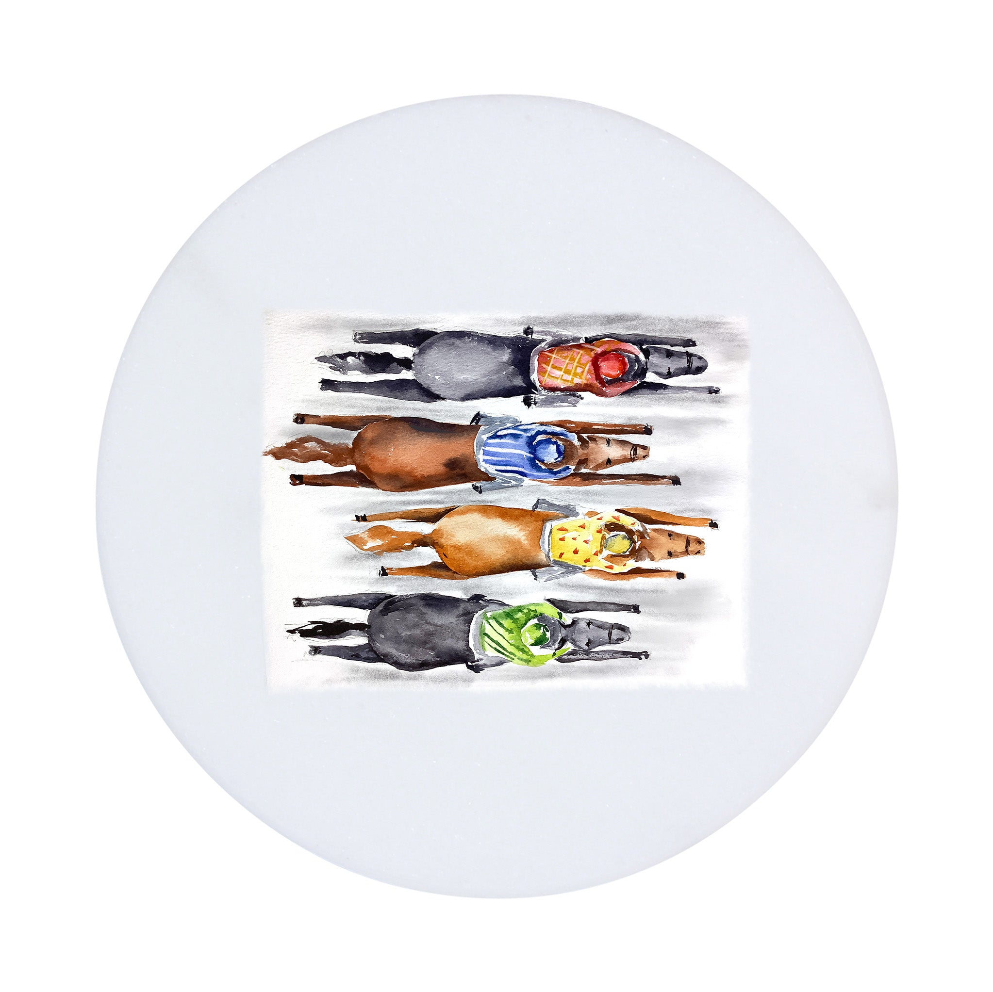 Bring fun to your table with the Racing Horses Ariel Marble Coaster! Crafted from smooth marble, this playful coaster features a lively horse race design that adds charm and character to any drink setting. Protect your surfaces while sparking conversation with a splash of whimsy and style. Perfect for horse lovers and anyone who enjoys a bit of spirited decor.