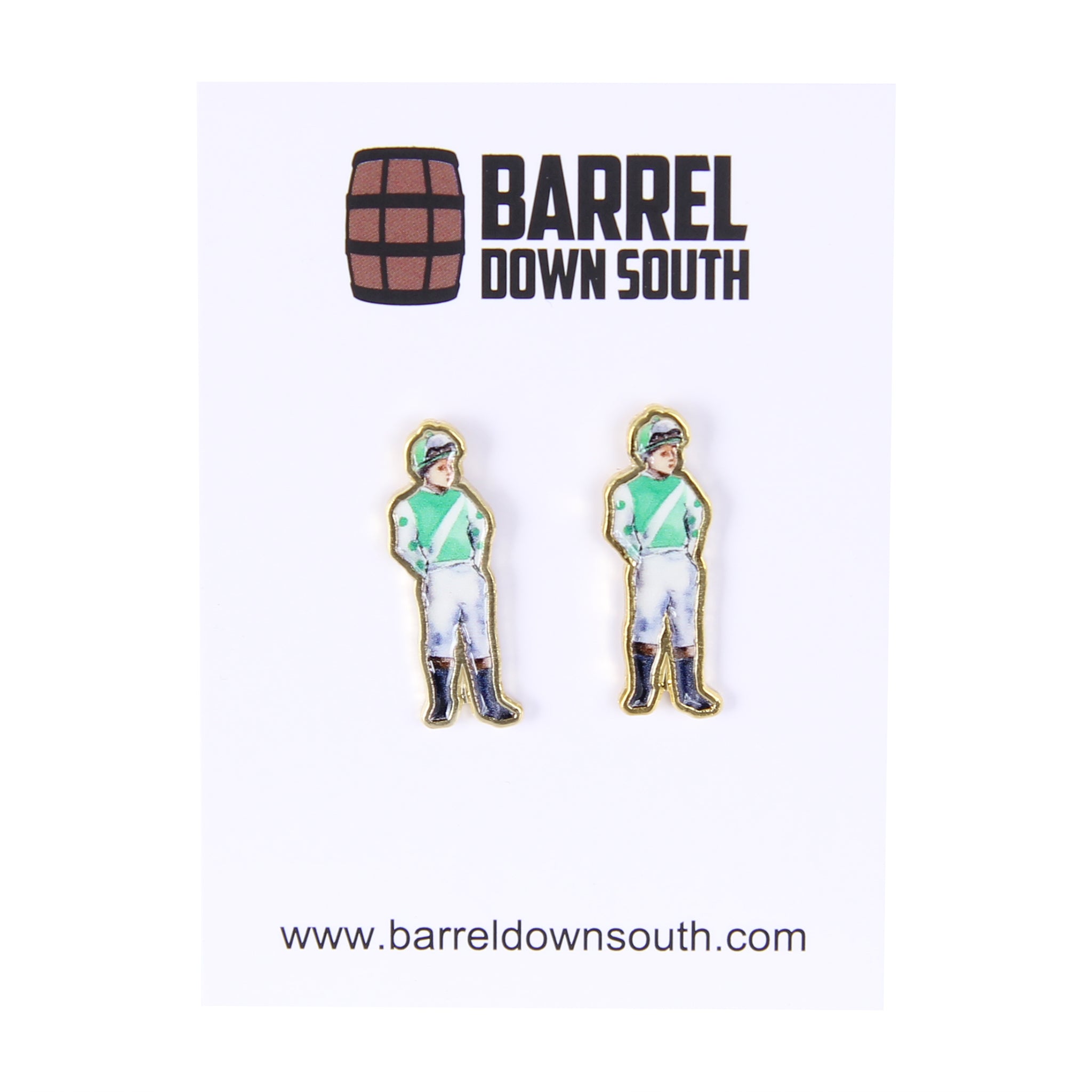 These charming Standing Jockey Stud Earrings celebrate equestrian style with whimsical green-clad jockey figures standing at attention. Perfect for horse lovers and racing enthusiasts, each pair brings a touch of quirky sophistication to any outfit. The playful design captures the spirit of the track while remaining wearable for everyday wear. A conversation starter that shows off your passion for all things horses.