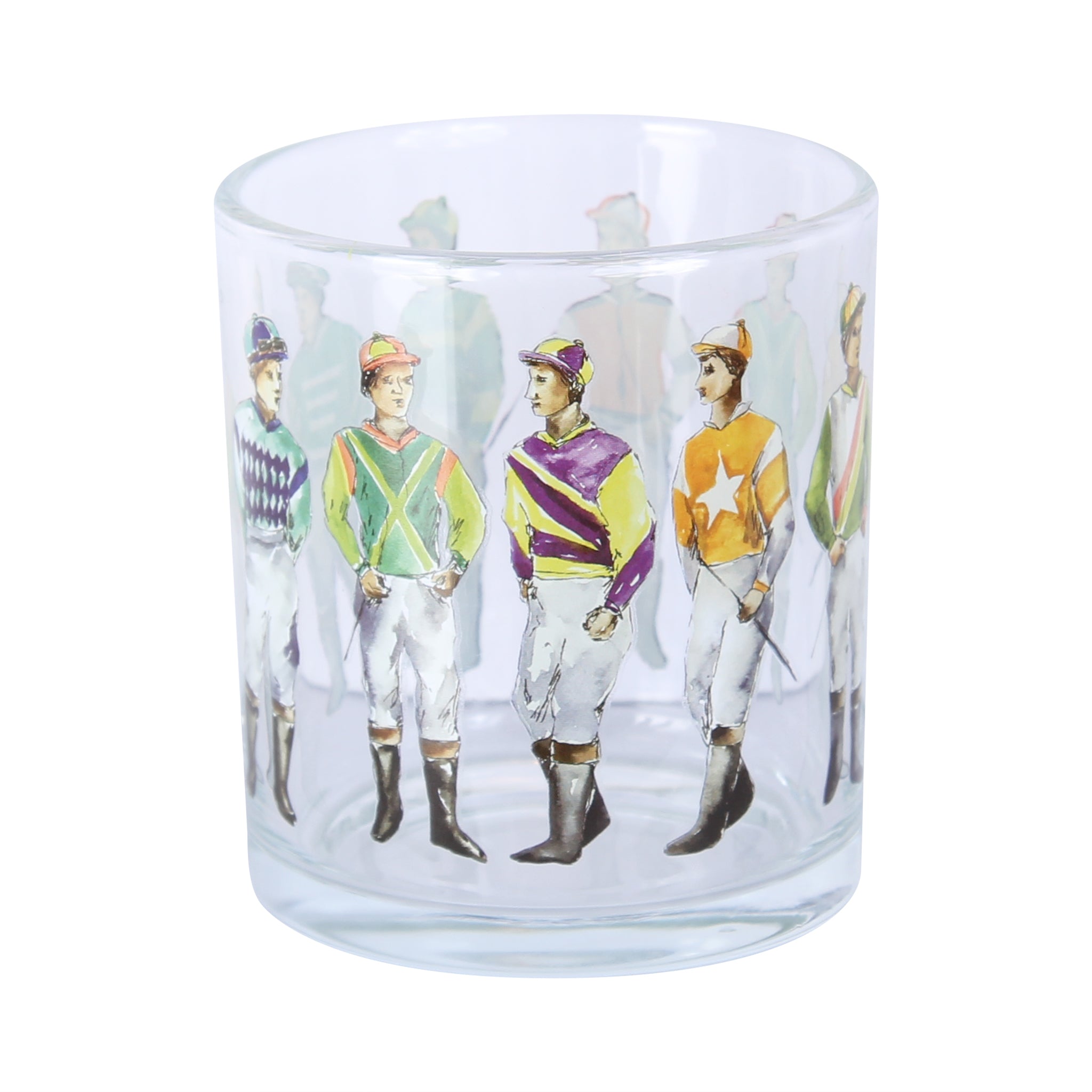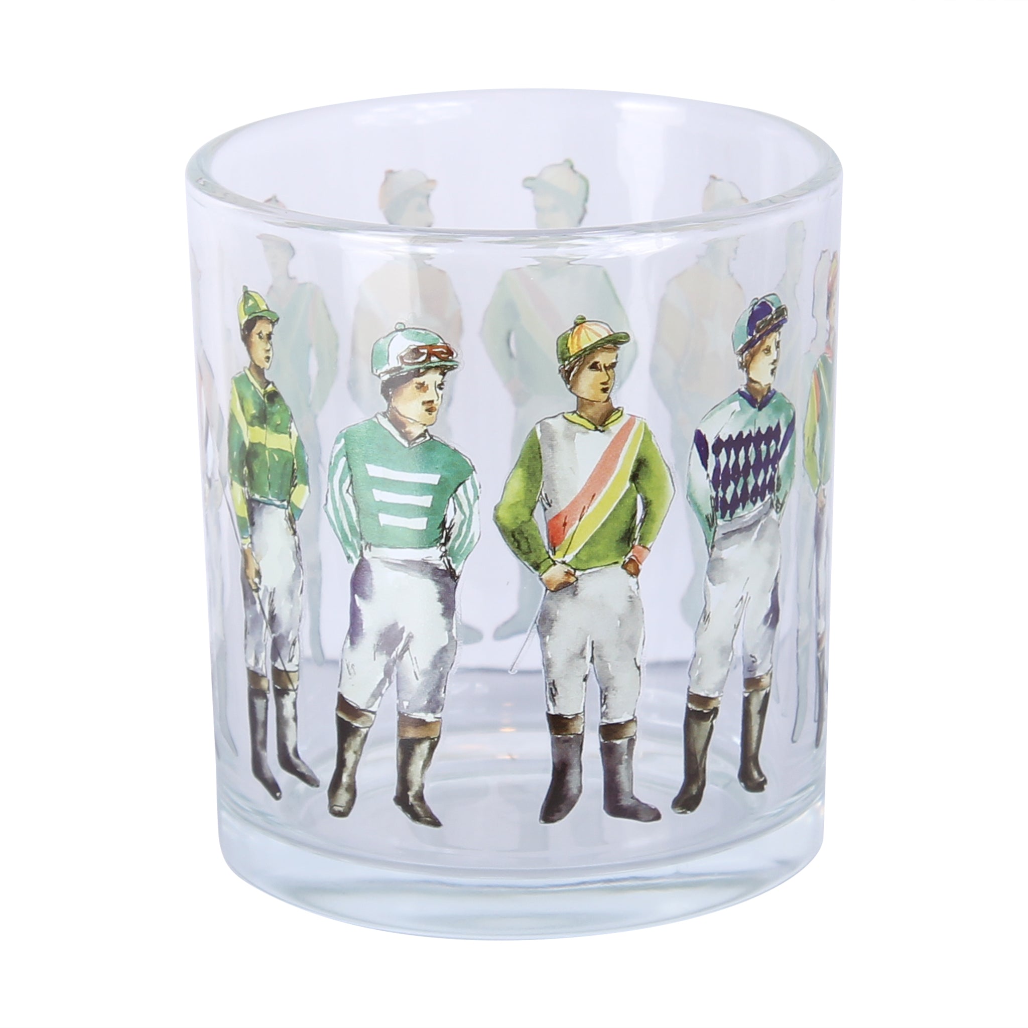 Saddle up for a spirited sip with this charming rocks glass featuring standing jockeys in full racing regalia. Perfect for whiskey, bourbon, or your favorite spirit, this wrapped design adds a touch of equestrian flair to your drinkware collection. Whether you're a horse racing enthusiast or simply appreciate quirky barware, this glass brings personality to every pour. A fun conversation starter that celebrates the thrill of the track—one toast at a time.