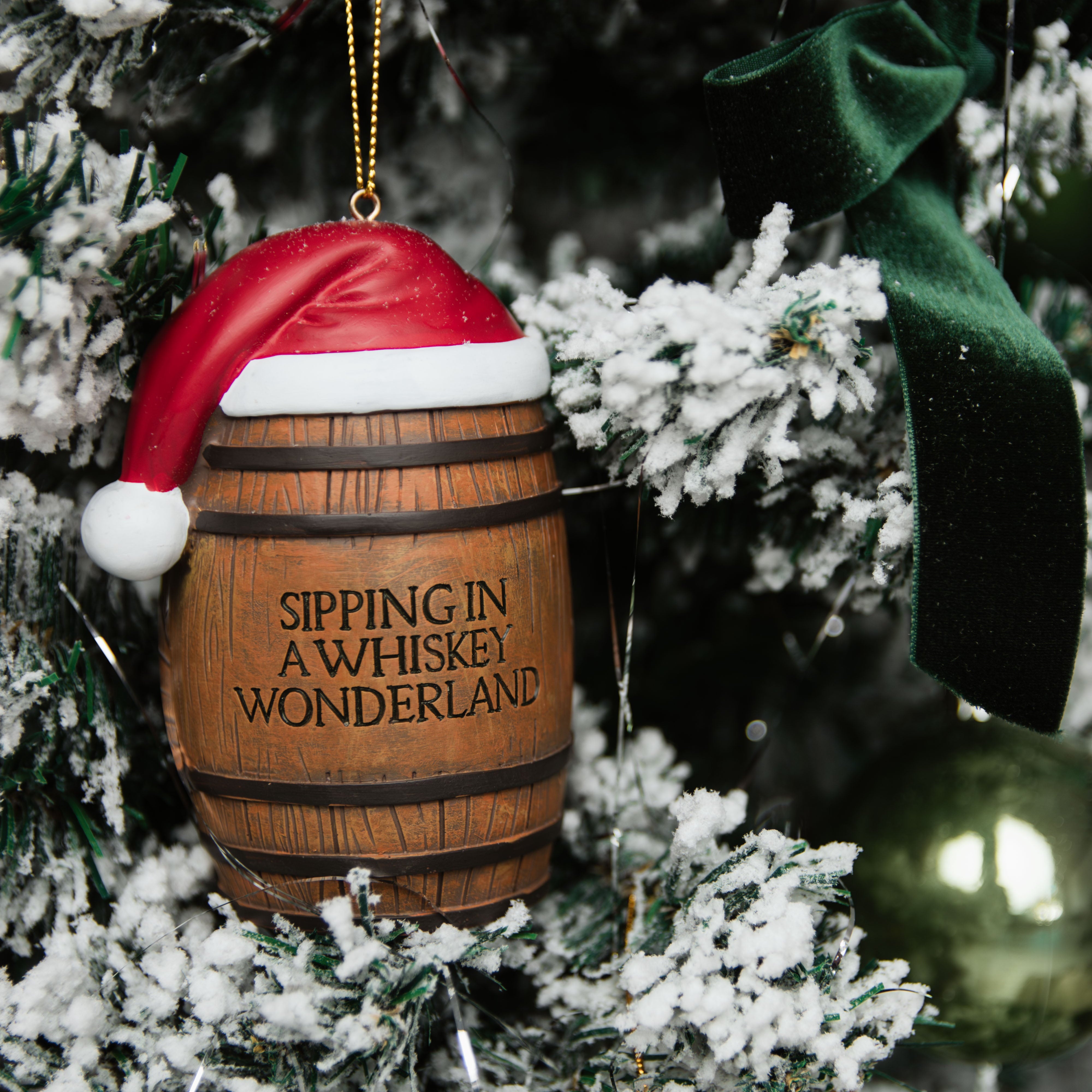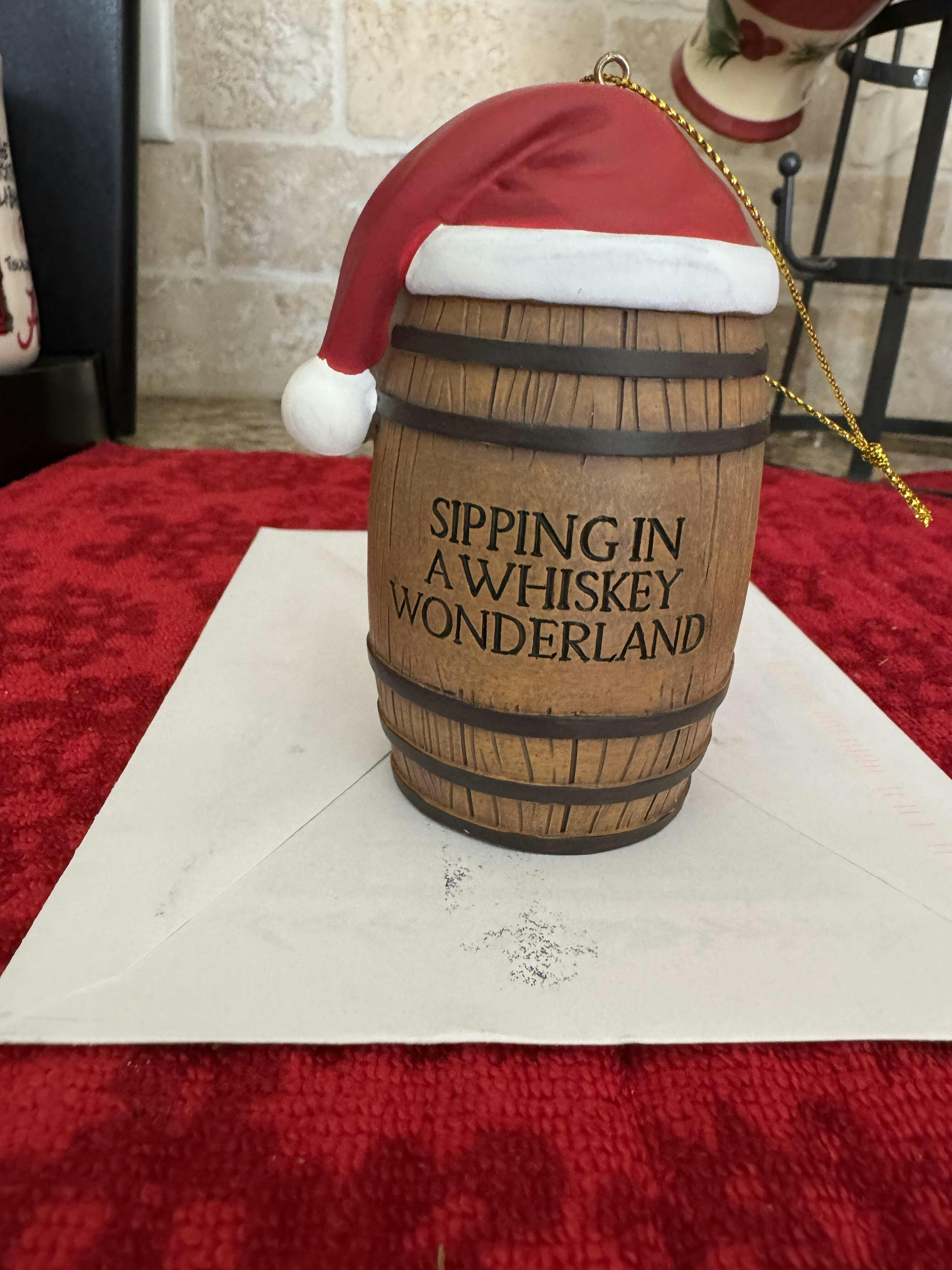 Resin bourbon barrel ornament with the text "SIPPING IN A WHISKEY WONDERLAND" engraved on the side. Ornaments are hand painted to resemble the look of a bourbon barrel. Ornaments are about 3.25 inches in height.