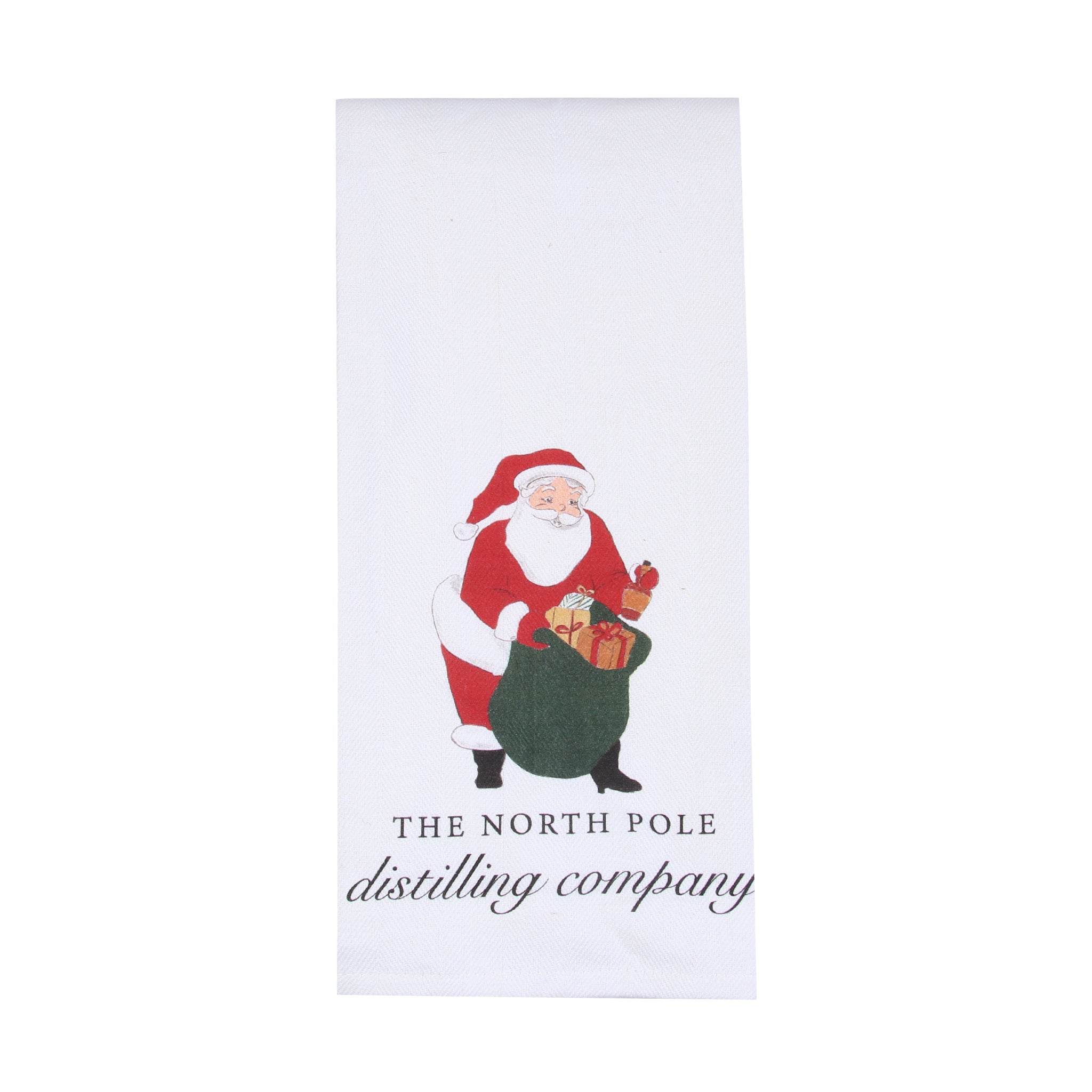 Celebrate holiday cheer with a playful twist in the kitchen featuring The North Pole Distilling Company Tea Towel. This festive design showcases Santa holding a bottle of bourbon, paired with cheeky text that brings a fun, spirited vibe to your seasonal décor.
