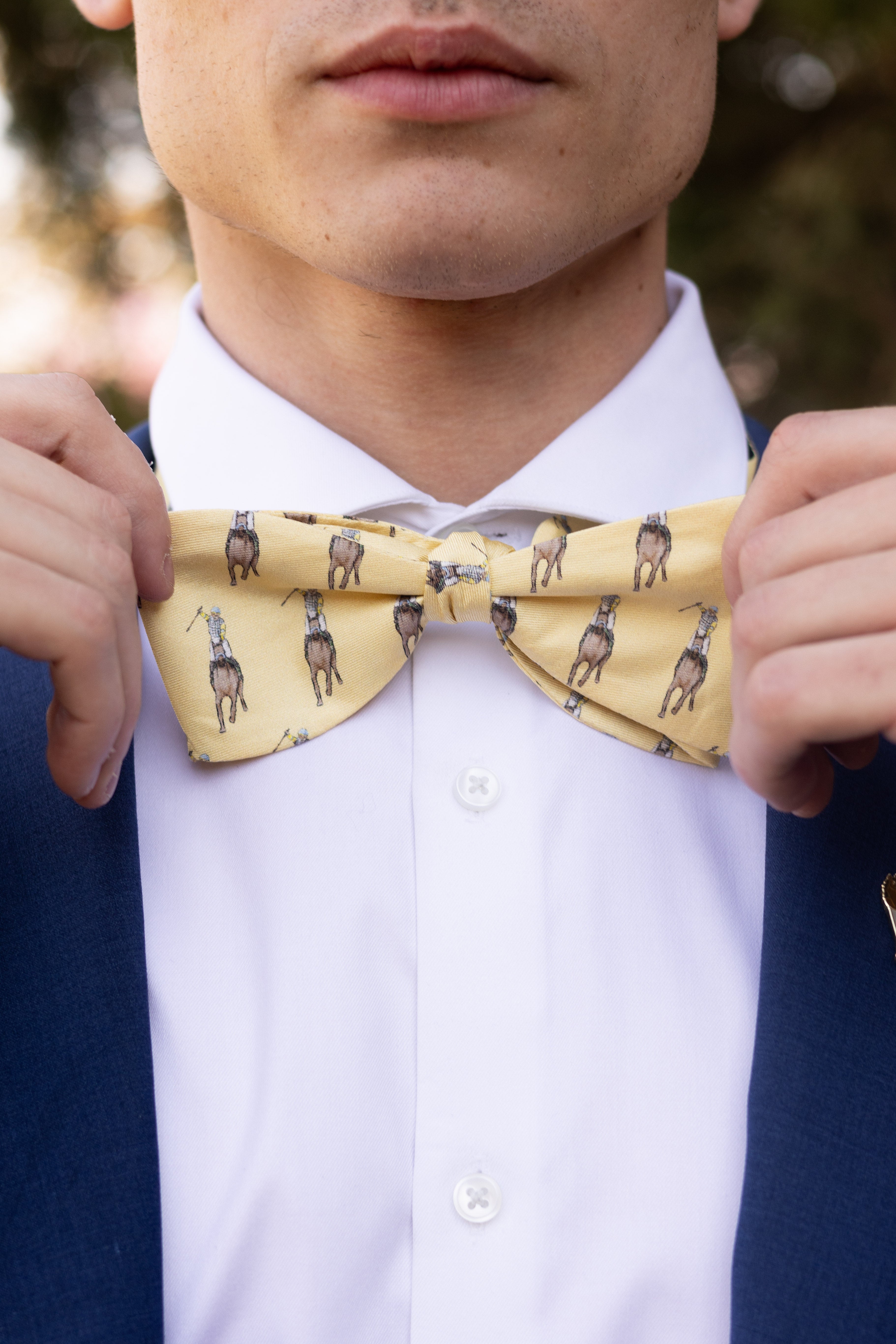 Add timeless elegance and Derby Day charm to your wardrobe with our Yellow Cheering Horse Racing Jockey Bowtie, a sophisticated nod to the thrill of horse racing and the tradition of Southern style. Set against a soft pastel yellow background, this bowtie features a detailed, repeating pattern of jockeys riding thoroughbreds, capturing the heart-pounding excitement of the Kentucky Derby and the grace of equestrian sport.